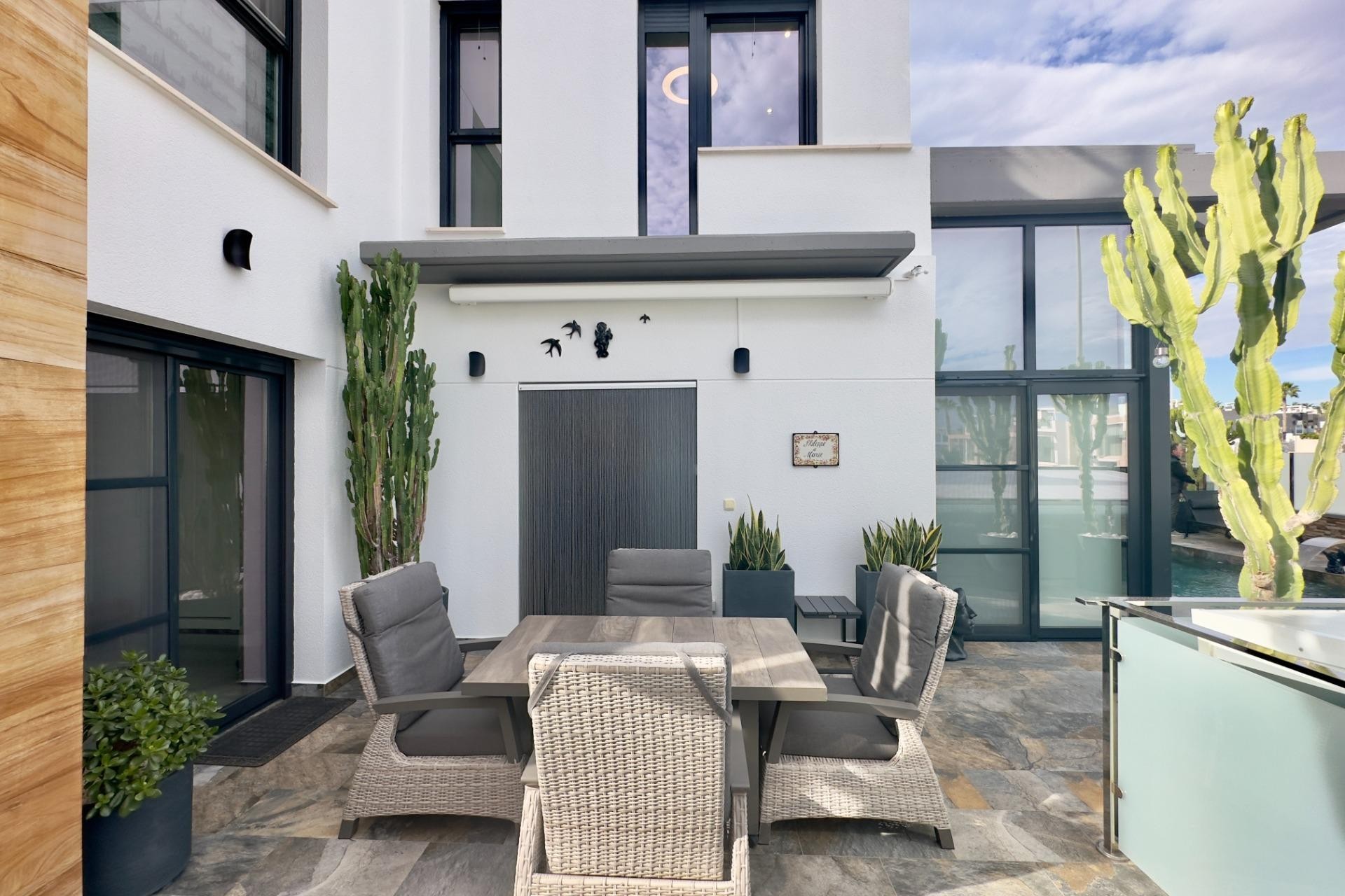 Magnífica villa independiente reformada en Lomas de Cabo Roig (Orihuela Costa), ubicada en una parcela de 197 m2 y equipada con todas las comodidades.~~La vivienda se distribuye en dos plantas más solárium. En la planta baja ofrece un amplio y luminoso salón-comedor con cocina americana y grandes ventanales con vistas a la piscina privada con cascada, además de un dormitorio y un baño con ducha. ~En la primera planta cuenta con dos dormitorios dobles y dos baños completos con suelo radiante. ~En la planta alta se disfruta de un espectacular solárium con vistas al mar, perfecto para relajarse durante todo el año. ~~La propiedad dispone de placas solares, trastero y parking dentro de la parcela. Ubicada en una zona tranquila y bien comunicada, esta villa es una oportunidad única para quienes buscan confort, privacidad y estilo en la Costa Blanca.~~Orihuela Costa es una de las zonas más atractivas de la Costa Blanca, conocida por sus playas de aguas cristalinas, su clima mediterráneo y su ambiente tranquilo pero con todos los servicios a mano. Cuenta con calas y playas con Bandera Azul, centros comerciales como La Zenia Boulevard, una amplia oferta de restaurantes y zonas de ocio, además de prestigiosos campos de golf. Con excelentes conexiones y un entorno ideal para vivir o disfrutar de vacaciones, Orihuela Costa combina calidad de vida, naturaleza y comodidad.