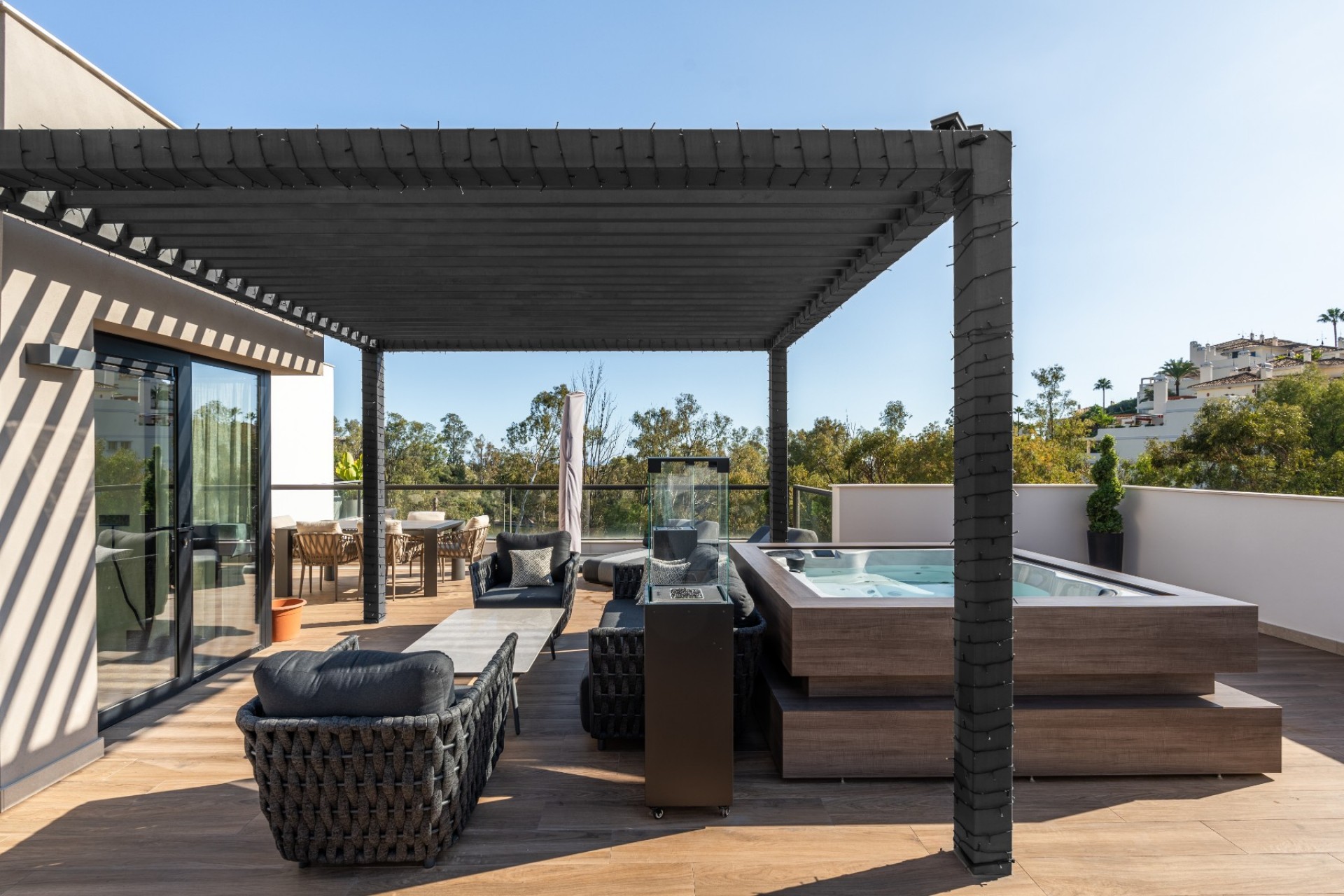 Bienvenido a este impresionante apartamento de 3 habitaciones y 2 baños en el corazón de Nueva Andalucía. Con vistas panorámicas del lago, las montañas y una vista parcial del Mediterráneo, esta propiedad ofrece una experiencia de vida única. En el interior, la luminosa área de salón y comedor de concepto abierto se conecta con una cocina moderna equipada con electrodomésticos de alta gama, ideal tanto para relajarse como para recibir invitados. La espaciosa suite principal tiene su propio baño privado, mientras que las otras dos habitaciones comparten un baño familiar contemporáneo. El punto culminante es la amplia terraza en la azotea, equipada con área de BBQ, jacuzzi, asientos para comer y descansar, e incluso una mesa de ping pong, perfecta tanto para la relajación como para el entretenimiento. Entre las comodidades adicionales se incluyen dos plazas de aparcamiento subterráneas seguras y un amplio trastero.