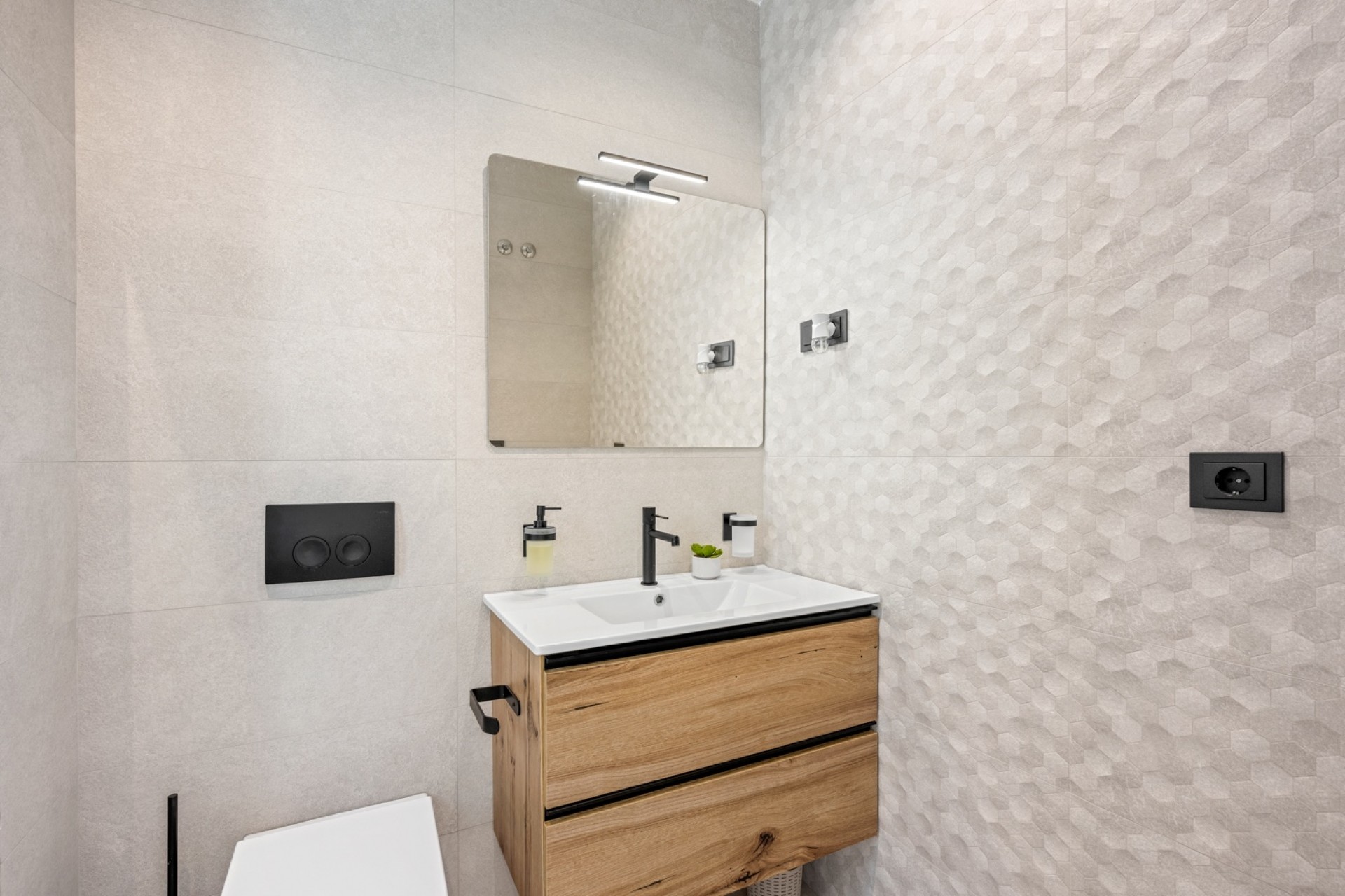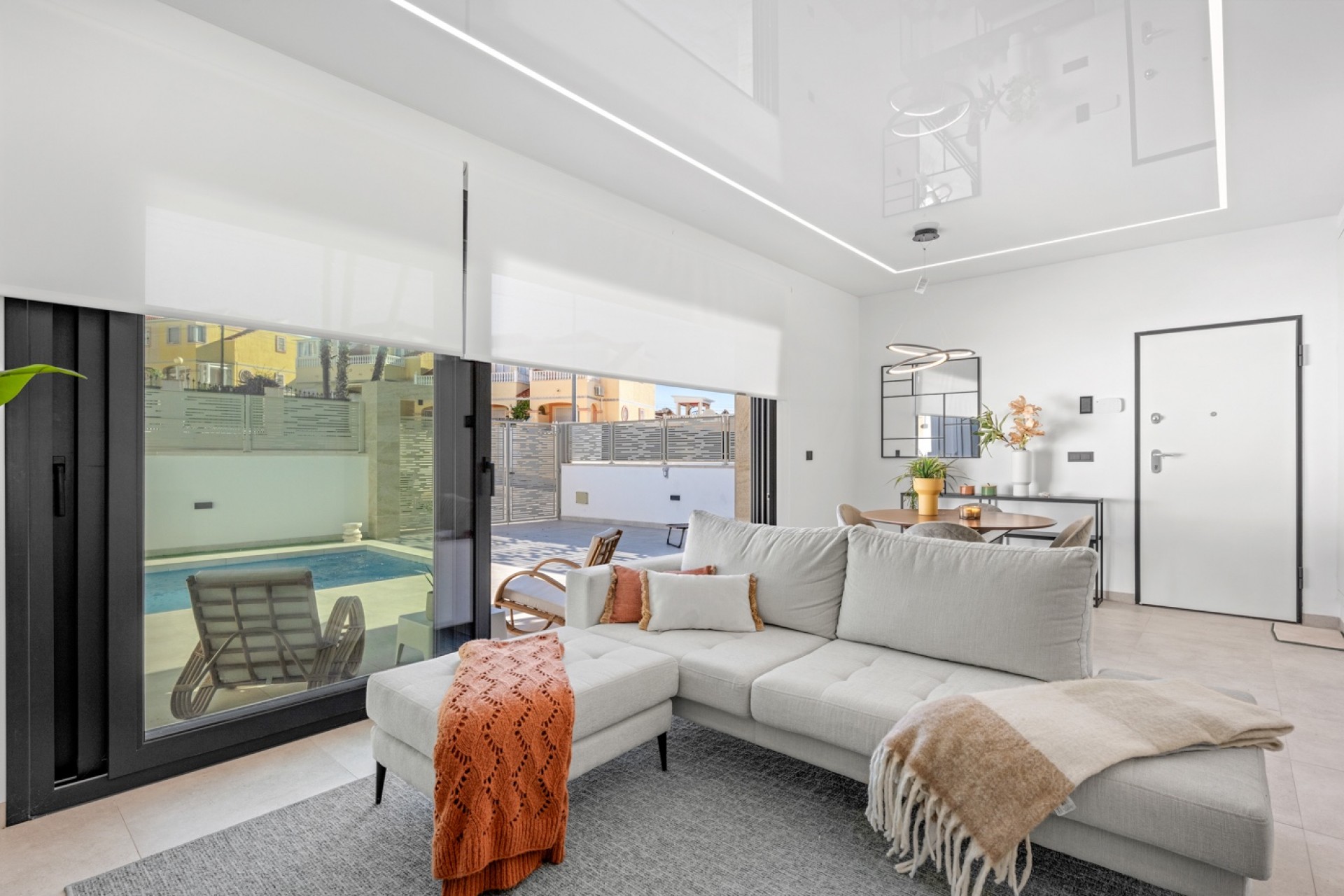 Située à Blue Lagoon, à deux pas de toutes les commodités, cette magnifique villa, initialement conçue comme maison témoin pour le projet, offre un confort et une qualité exceptionnels. Les finitions haut de gamme, réalisées avec des matériaux de qualité, ainsi que de nombreux équipements de série (domotique, alarme, volets roulants électriques, etc.) en témoignent. Le séjour spacieux et lumineux s'ouvre harmonieusement sur la terrasse avec piscine privée, créant ainsi une agréable continuité entre intérieur et extérieur. Un parking sur place, à la fois pratique et sécurisé, est également disponible. Au rez-de-chaussée se trouve également une chambre complète avec salle de bains attenante, idéale pour ceux qui préfèrent tout avoir de plain-pied ou pour les invités. Jouxtant la cuisine se trouve un débarras avec accès direct à la terrasse exposée ouest, idéale pour profiter du soleil de l'après-midi et du soir. L'escalier mène à l'étage supérieur, où se trouvent deux chambres spacieuses, chacune avec sa propre salle de bains. De là, un second escalier conduit à un vaste solarium offrant une vue panoramique imprenable à 360° sur ce quartier charmant et paisible. La mer et le centre commercial populaire La Zenia Boulevard sont à seulement 10 minutes en voiture, tandis qu'un supermarché, une pharmacie et divers magasins sont accessibles en 3 minutes. La maison est vendue meublée et équipée de meubles design de haute qualité, vous permettant d'en profiter immédiatement et sans aucun souci. Une villa de qualité bénéficiant d'un emplacement exceptionnel, idéale comme résidence principale, maison de vacances ou investissement. Ici, vous pouvez vivre sans soucis, avec style et en plein centre-ville.